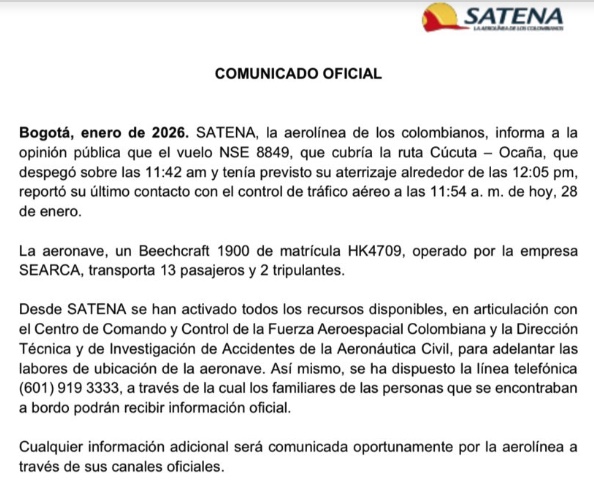 Un portavoz de la aerolínea confirmó a EFE que están investigando lo sucedido con la aeronave, que al parecer despegó del aeropuerto Camilo Daza, de Cúcuta, capital de Norte de Santander, hacia Ocaña, pero no llegó a la hora prevista al aeropuerto Aguas Claras de esa ciudad, la segunda del departamento.