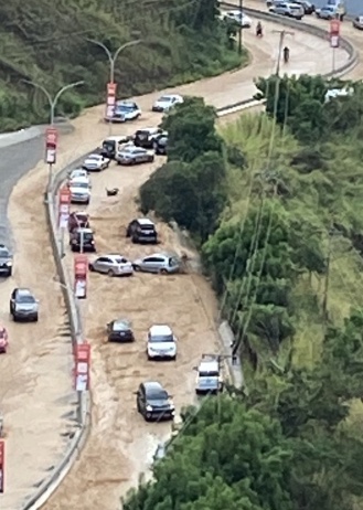 Una tubería de gran calibre colapso en la Urbanización Los Naranjos y el río de agua que se produce en este momento ha arrastrado autos  y conductores que transitaban  por la conocida bajada en la principal vía que comunica Las Américas con Colinas de Los Naranjos. A esta hora se vive un caos en la zona. Se recomienda a los conductores que tomen vias alternas como La Trinidad, por ejemplo
