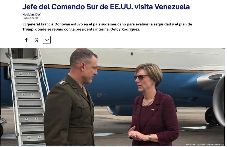 El jefe del Comando Sur de los Estados Unidos de América, General Francis L. Donovan, visitó Caracas este miércoles 18 de febrero para sostener una reunión con la presidenta (E.) de la República Bolivariana de Venezuela, Delcy Rodríguez Gómez, el ministro del Poder Popular para la Defensa, Vladimir Padrino López, y el ministro del Poder Popular para Interior, Justicia y Paz, Diosdado Cabello Rondón.