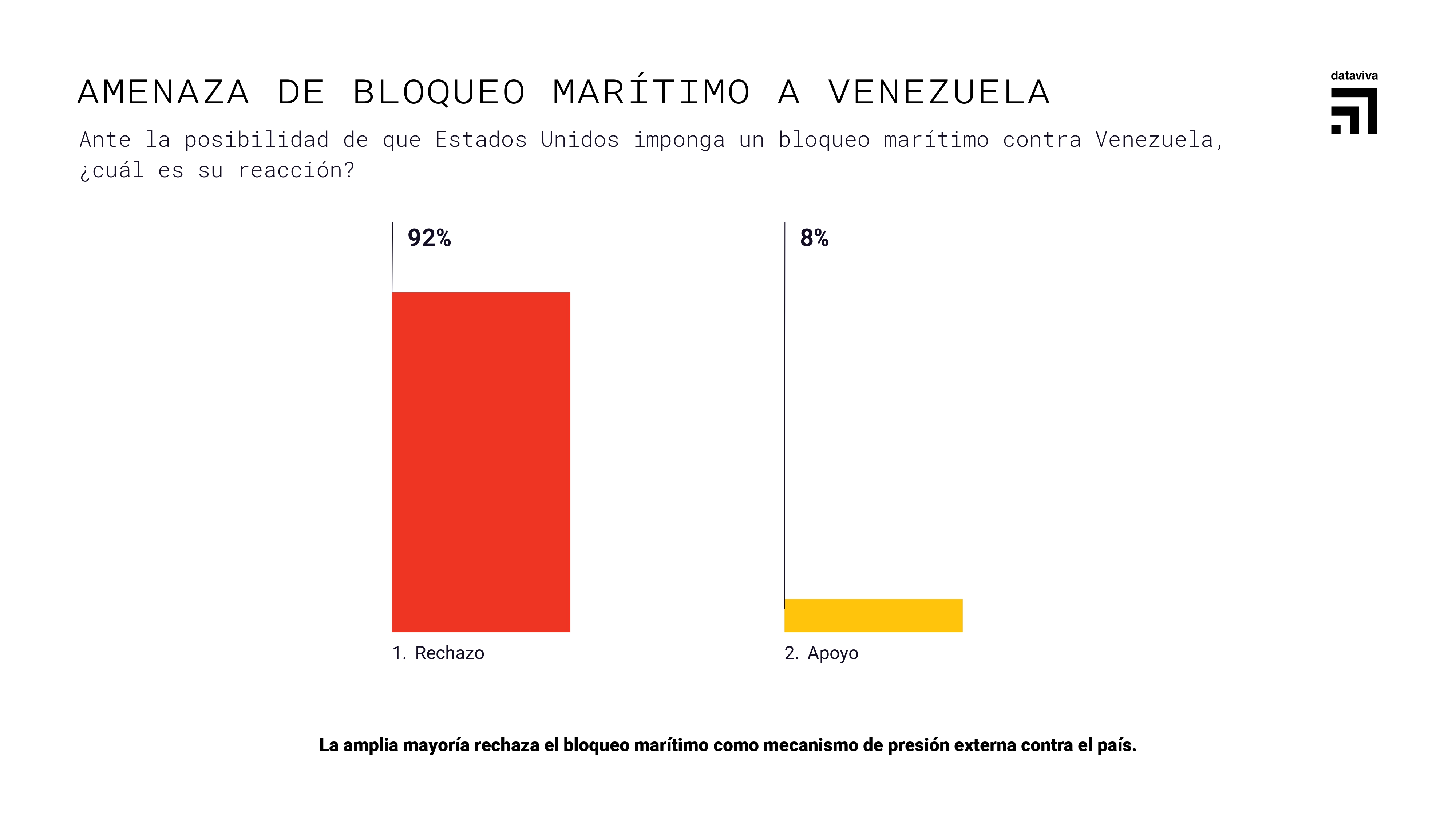 Frente a la posibilidad de un bloqueo marítimo contra el país, el 92% de los consultados rechazó esta medida, mientras que solo un 8% la respalda, dejando en evidencia que las sanciones y medidas coercitivas unilaterales son percibidas como un castigo colectivo contra la población.