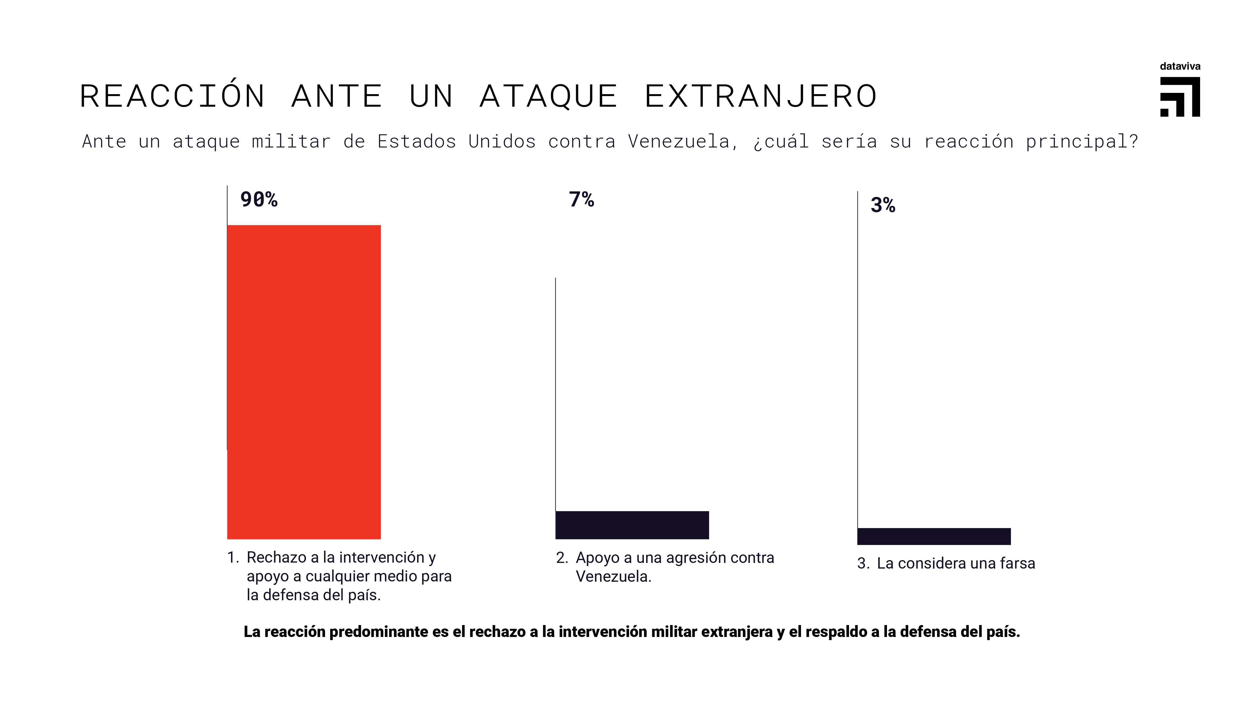 Ante un eventual ataque militar de Estados Unidos, el 90% del pueblo venezolano rechaza cualquier forma de intervención extranjera y manifiesta su disposición a defender el país, mientras que apenas un 7% apoya una agresión armada. Un 3% considera estas amenazas como una farsa, lo que refuerza el rechazo generalizado a la escalada belicista.