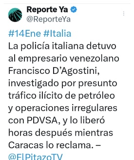 Francisco D’ Agostino, cuñado de Henry Ramos Allup, detenido y liberado en Italia 14 de enero de 2026 by Victor Garcia uncategorized Previous News Donald Trump confirma que habló por teléfono con Delcy Rodríguez: “Es una persona estupenda” Next News Excarcelados varios periodistas detenidos en Venezuela Victor Garcia