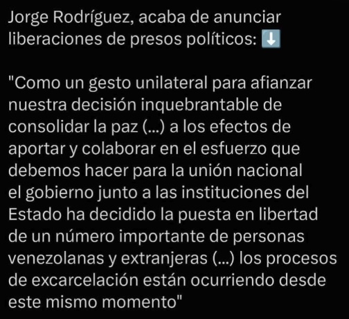 Se trata de las primeras excarcelaciones bajo el interinato de Delcy Rodríguez, que asumió funciones de manera temporal tras una operación militar de Estados Unidos el 3 de enero en la que capturó al mandatario depuesto Nicolás Maduro y su esposa, Cilia Flores.