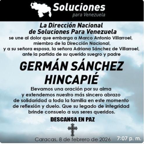 Ha fallecido cristianamente Germán Sánchez Hincapié – QEPD – 8 de febrero de 2026 by Victor Garcia ActualidadNacionalesNoticias Germán Sánchez Hincapié, fue en vida padre de Adriana Sánchez de Villarroel y padre político y suegro de Marco Antonio Villarroel, hermano de la vida de nuestro Editor Presidente Víctor Manuel García Hidalgo Previous News El Primer Preso Político de Nicolás Maduro habla de la Ley de Amnistía y otros temas de gran interés Next News MP solicitó la detención domiciliaria de Juan Pablo Guanipa Victor Garcia