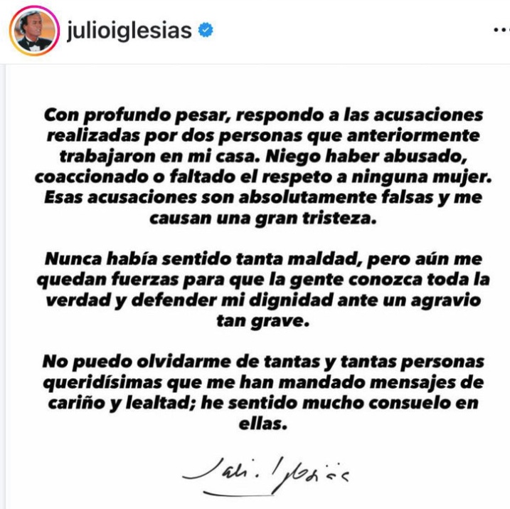 El cantante español Julio Iglesias respondió este viernes a las acusaciones realizadas por dos de sus exempleadas al afirmar que nunca ha abusado, coaccionado o faltado al respeto a ninguna mujer