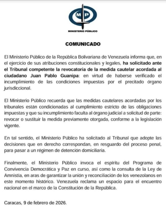 CARACAS.- El Ministerio Público solicitó formalmente ante los tribunales la revocatoria de la medida cautelar de Juan Pablo Guanipa, tras alegar un incumplimiento en las condiciones impuestas por el juzgado