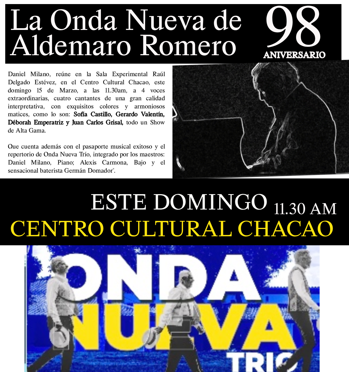 Onda Nueva Trio celebra los 98 AÑOS de Aldemaro Romero CC Chacao 14 de marzo de 2026 by Victor Garcia ActualidadCulturaEntretenimientoNacionalesNoticias Previous News Victor Garcia