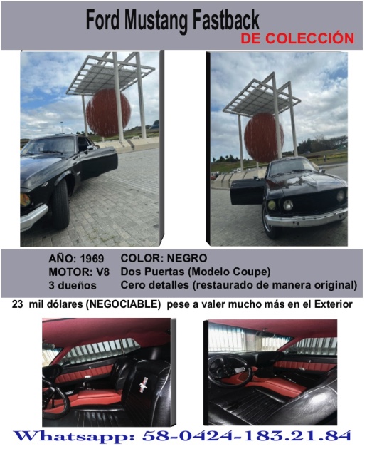 Te lo vendo – InfoTV e-commerce: Mustang De Colección, excelente estado, buen precio negociable 6 de enero de 2026 by Victor Garcia ActualidadEconomía Ford Mustang Fastback (Carro de colección) Año 1969 Motor: V8 3 dueños Color negro Dos puertas (modelo coupe) Cero detalles (restaurado de manera original) Contacto y Negociación por Whatsapp: 58-0424-183.21.84 Previous News Feliz Día de Reyes para todos los venezolanos que siguen la Estrella del Niño Jesús Next News ETAPAS DEL DUELO: María Corina, está en NEGACIÓN. Pide hablar con Trump, para entregarle el Premio Nobel Victor Garcia