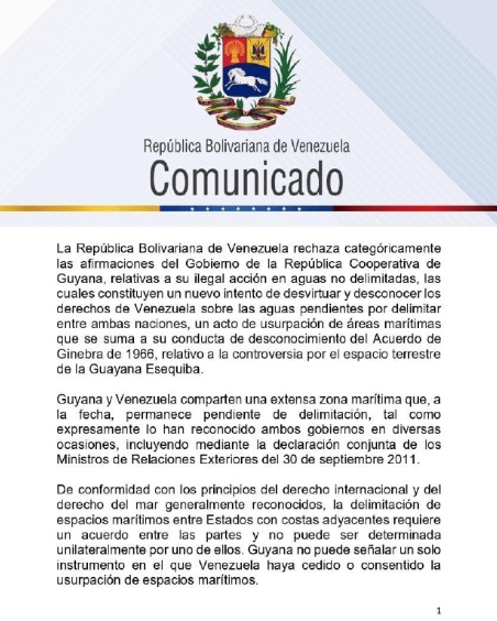 En el texto se destaca que esta acción es «un acto de usurpación de áreas marítimas que se suma a su conducta de desconocimiento del Acuerdo de Ginebra de 1966, relativo a la controversia por el espacio terrestre de la Guayana Esequiba».